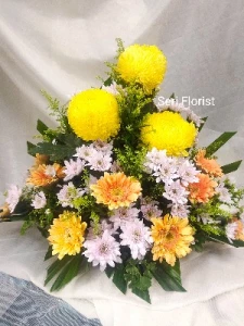 Fresh and vibrant golden yellow arrangement of fresh chrysanthemum, gerbera daisy and solidago flowers. Ideal flowers for altar, table centerpiece and cemetery visit.