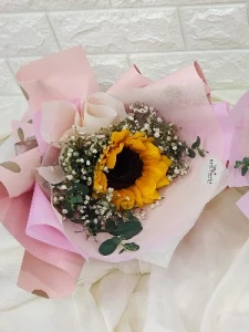 A single stalk sunflower with dash of cotton baby breath and leaves to complete the aesthetic look of the petite bouquet.