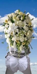 Fresh flowers of mix premium flowers such as lilies, roses, daisies, ping pong, chrysanthemum and green foliage. Ideal for funeral and memorial occasions. Single tier flower arrangement. Condolence message card.